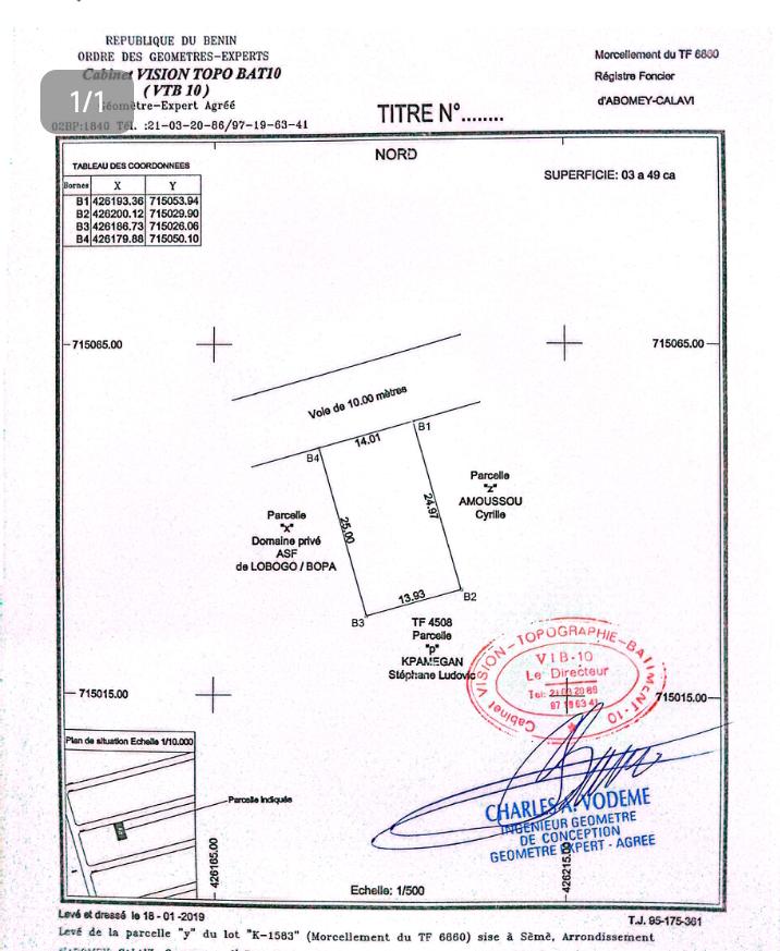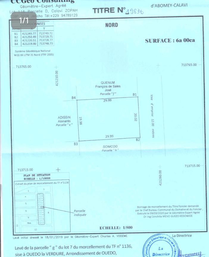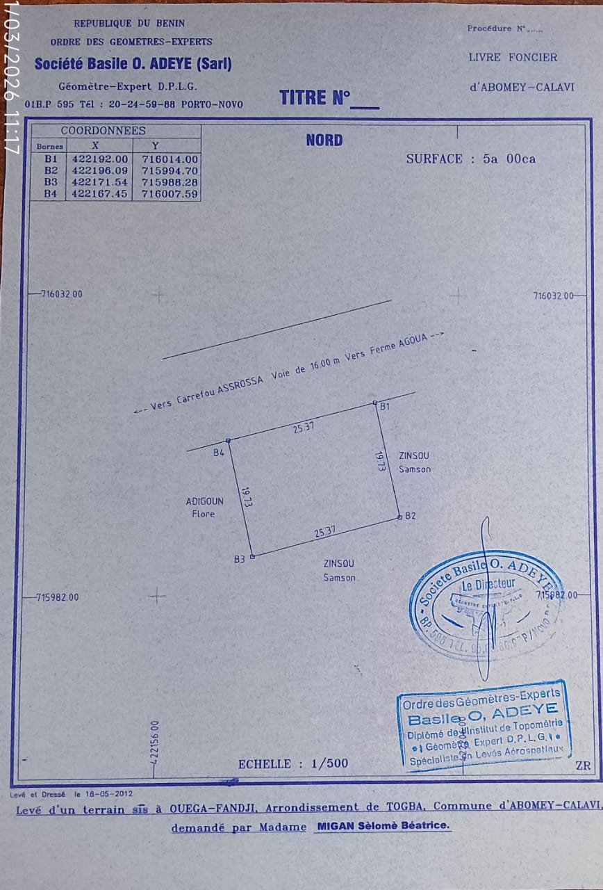 OPPORTUNITÉ IMMOBILIÈRE * PARCELLE SÉCURISÉE RECASÉE 545m² CLÔTURÉE AVEC ATTESTATION DE RECASEMENT À CALAVI ZOPAH* À vendre à CALAVI ZOPAH 1 PARCELLE SÉCURISÉE RECASÉE 545m² clôturée avec ATTESTATION DE RECASEMENT très bien située. à seulement *50 m du complexe scolaire Saint Romaric* Titre de propriété ️ Fiche bleue certifiée ZOPAH ️ *Attestation de recasement* *POSSIBILITÉ DE PAYER EN DEUX TRANCHES* *VENTE SÉCURISÉ DEVANT LE NOTAIRE* *PRIX 16.000.000* TITRE DE PROPRIÉTÉ ATTESTATION DE RECASEMENT 🏼 ️NB1 *L'ACQUÉREUR DOIT PAYER 5% DU PRIX D'ACHAT POUR LA COMMISSION IMMOBILIÈRE OBLIGATOIREMENT* 🏽NB2 FRAIS DE VISITE 🏼 5.000 NB3 *APPEL DIRECT OU APPEL WHATSAPP OBLIGATOIRE POUR RÉPONSE RAPIDE*